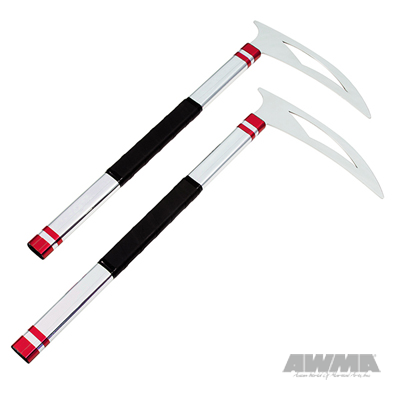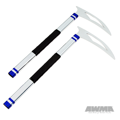Add some flash to your kama demonstrations with these hand crafted kamas. Made by hand, each aluminum blade is cut using laser precision technology and hand polished to a mirror shine. Each handle is made of lightweight, individually hand cut and sanded wood and grip wrapped to help reduce slippage. The handle is then decorated in color and chrome. Perfectly balanced. Made in the USA. The best kama for on-stage tournament use, measures 14&quot overall length. Stand not included.
