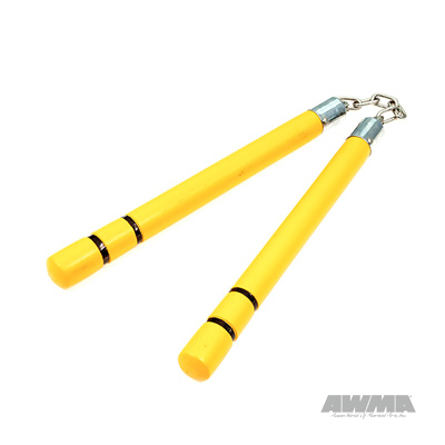 Golden yellow wooden handles with two black stripes at the bottom ends. 12" round handles. Ball bearing swivel chain for easy spinning during competitions or workouts. These chucks are very similar to the chucks used by Bruce Lee in the movie "Game of Death".