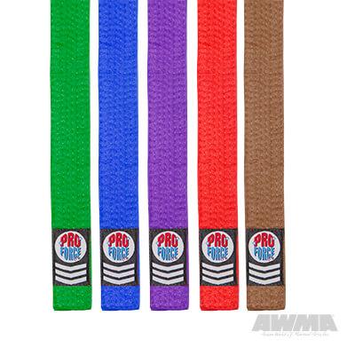 These karate belts are made of 100% polyester. Available in all rank colors: White, Yellow, Orange, Green, Blue, Purple, Red, Brown, Black and Pink. Available in sizes 0-8. 1-1/2" wide. Each belt is double wrapped and features 8 rows of stitching.