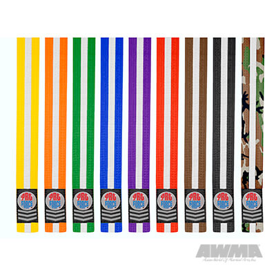 These karate belts are made of 65% polyester and 35% cotton. Available in 6 rank colors with white stripe: yellow, orange, green, blue, purple and black. Available in sizes 0-7. 1-1/2&quot wide. Each belt is double wrapped and features 8 lines of stitching.