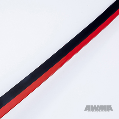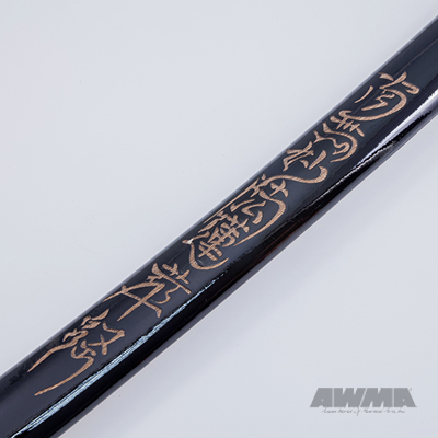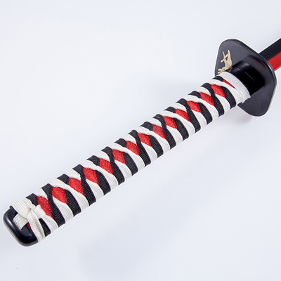 Features a two toned (red/black) blade with a black lacquer finished scabbard with Japanese inscription. Measures 41" overall, the blade measures 27.5".